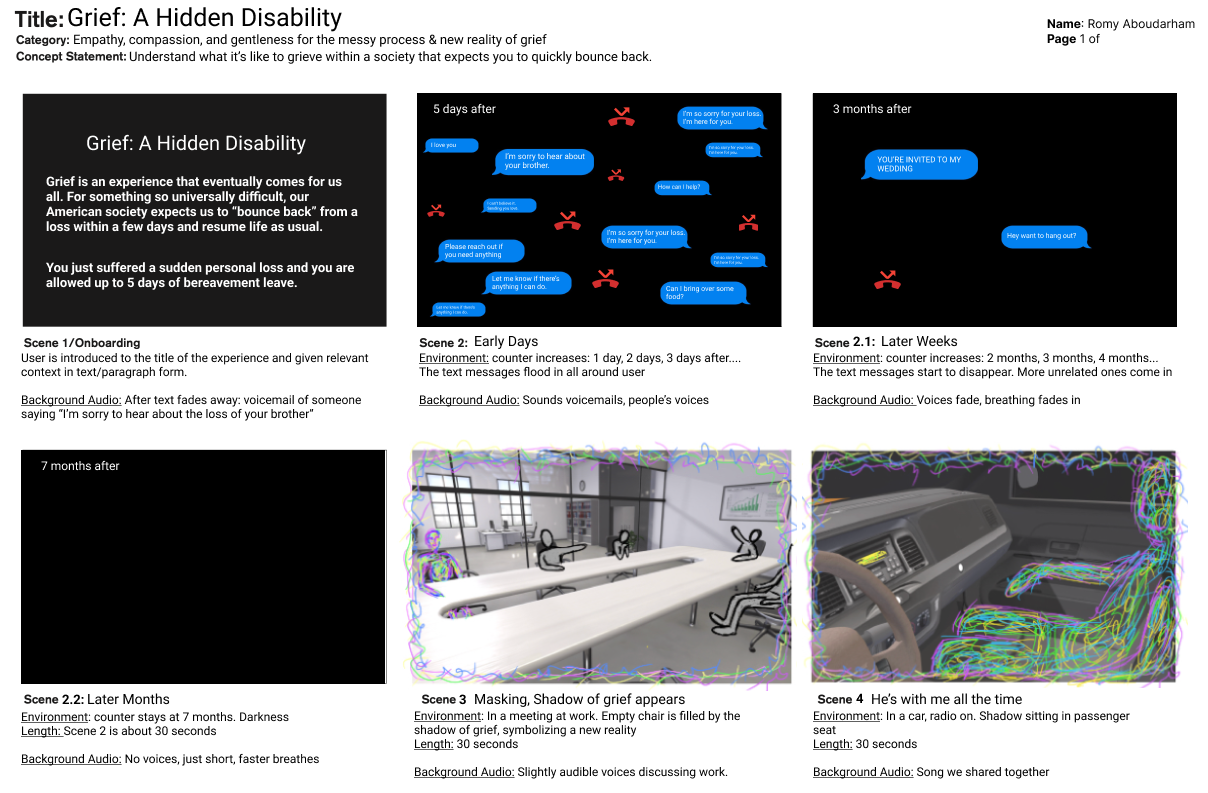 Utilizing VR to immerse users in the moment to moment reality of someone grieving the loss of a loved one. Designed as a therapeutic tool for learning how to move through grief.